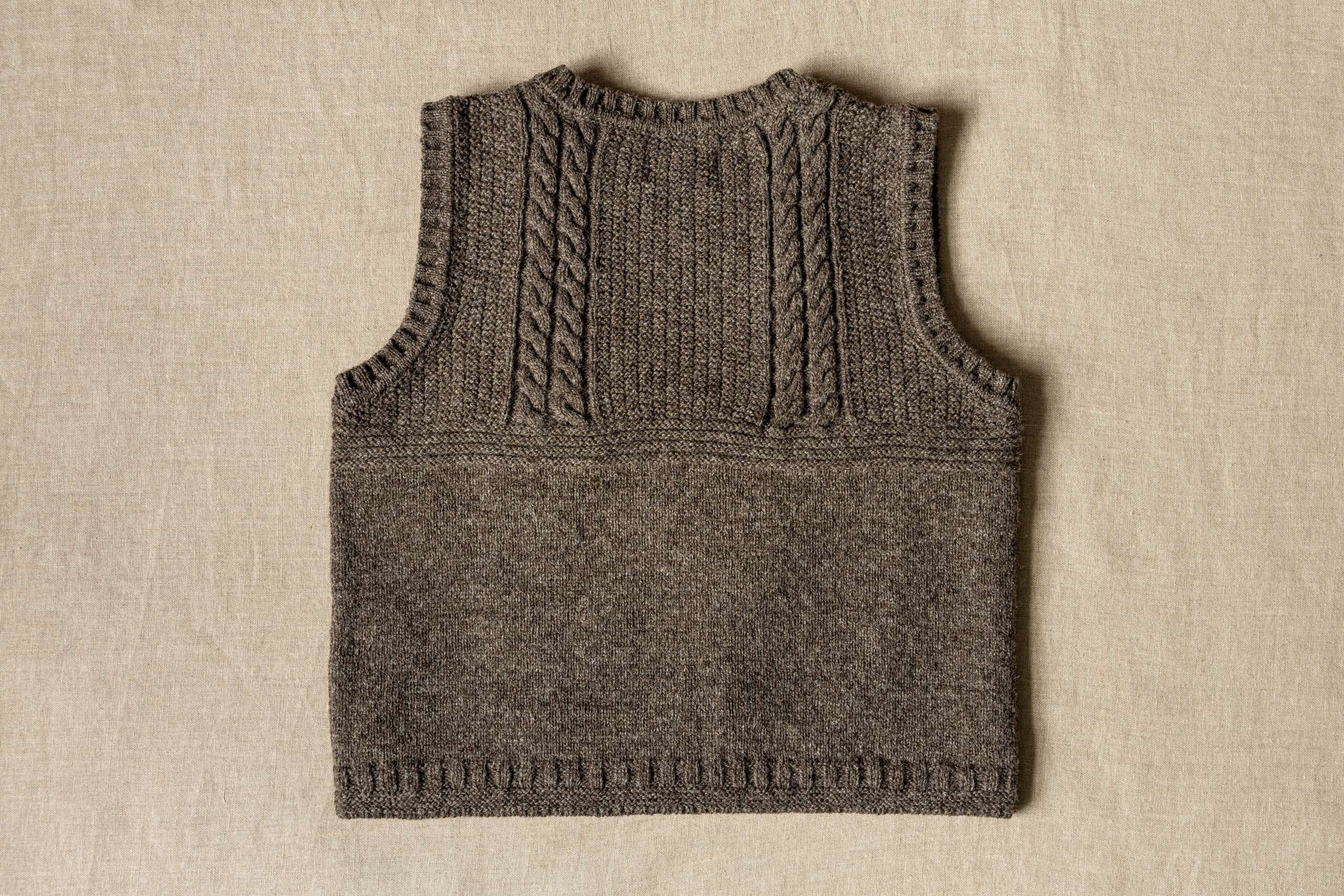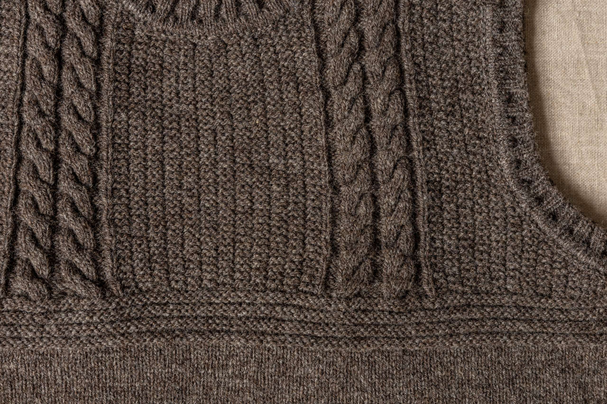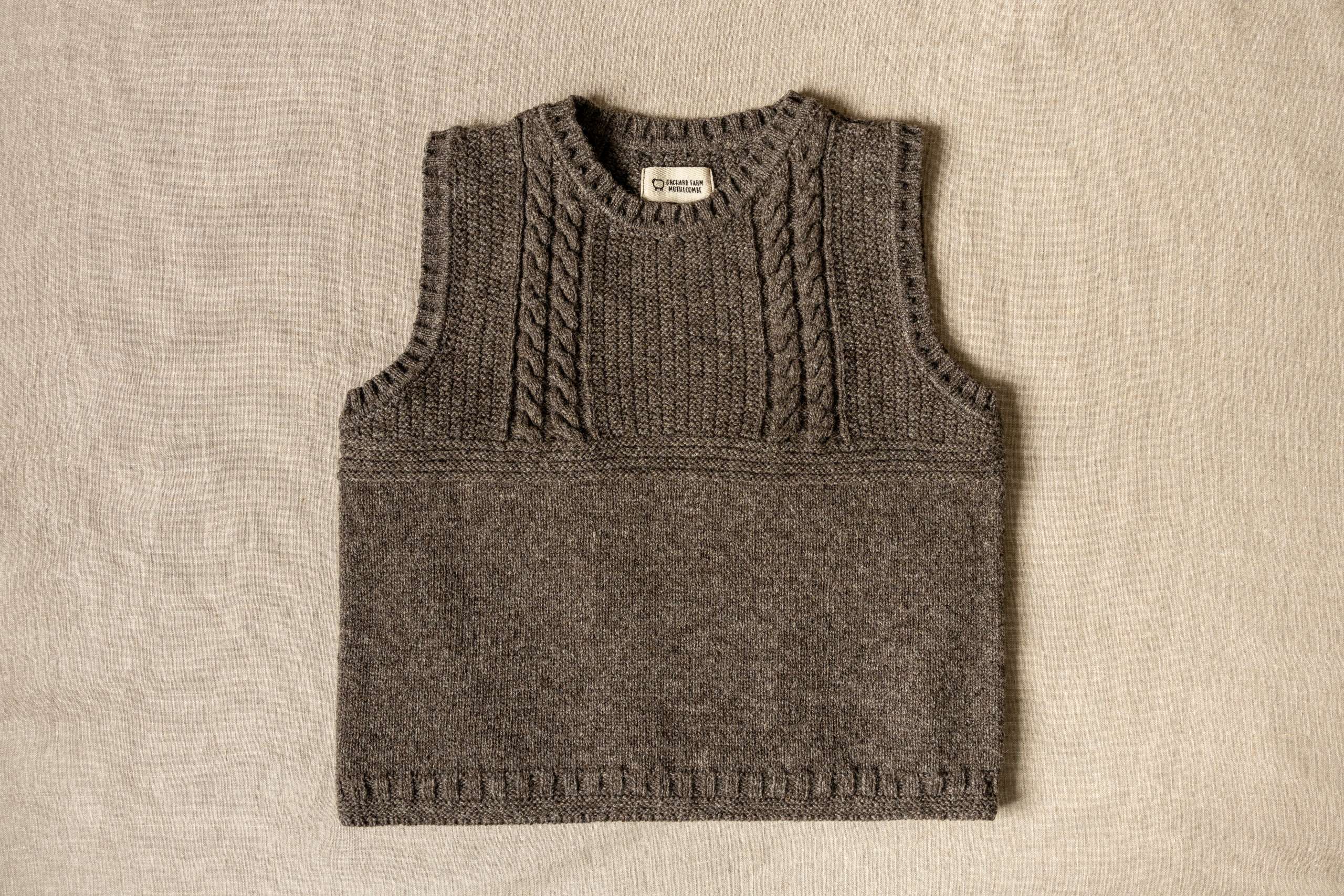 Our Sleeveless Gansy is our first Gansy produced from our Coloured Ryeland Flock which graze on our pastures beside the Erme Estuary, overlooking Mothecombe Beach. The design is inspired by the Gansy traditions of coastal fishing knitwear with the cable stitch signifying “safe passage” and the moss stitch, representing the texture of the carrageen moss seaweed on which Herring feed and symbolise optimism for a “bountiful harvest”. Slow, sustainable knitwear made from our Coloured Ryeland wool, has been grown within a regenerative farming system that puts nature at the very heart of our practices. The yarn is spun at the Natural Fibre Company in Cornwall and knitted in the British textiles heartlands in the Midlands.
